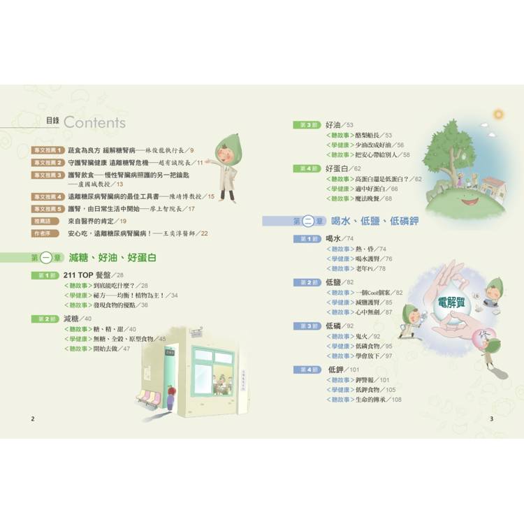 感恩台北慈院江政陽、巫虹萱、楊灼華、徐瑞昀四位營養師, 與王醫師協力合作,設計一日三餐食譜,讓讀者學習自行搭配,搭配久了,應能妥善掌握健康飲食的原則。罹患糖尿病或腎臟病,病程階段不同,要留心控制飲食的方法,例如輕度的腎臟病變跟第五級腎衰竭需要洗腎的人,哪些能吃、哪些不能吃、該怎麼吃,就不大一樣。書中內容再搭配上營養師的叮嚀,病人就更容易執行醫師所要求的限水、控制鈉磷鉀等配合事項。