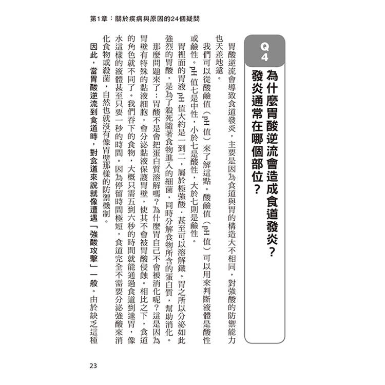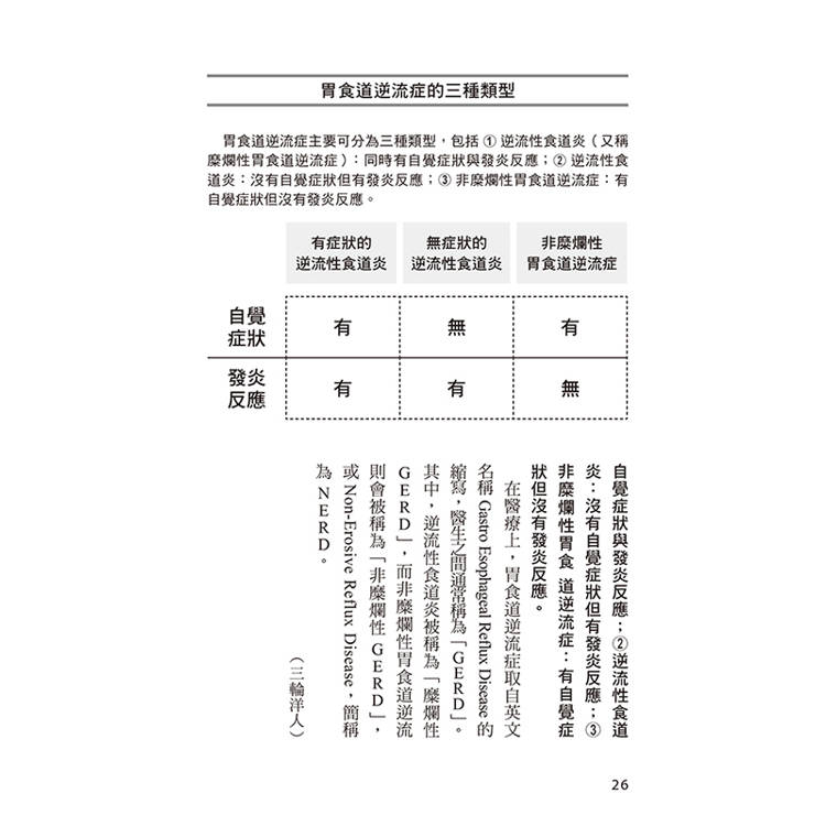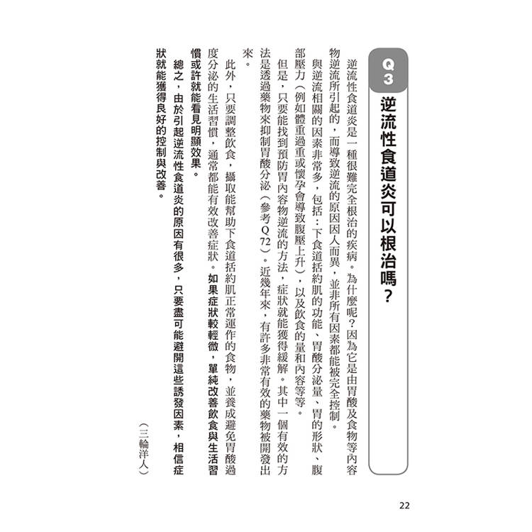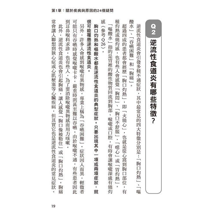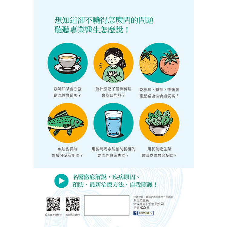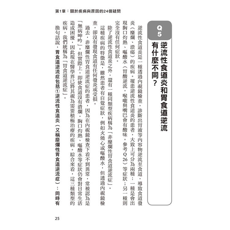 從「為什麼會胃酸逆流?」、「駝背真的會讓情況變嚴重嗎?」到「綠茶、咖啡該戒嗎?」、「市售成藥有用嗎?」、「需要手術嗎?」──每一題都以臨床經驗與實證醫學為基礎,提供實際可行的建議。書中不僅介紹最新藥物與內視鏡治療技術,也收錄中醫、運動、飲食與睡姿等多角度的自我改善方法,幫助讀者找到最適合自己的調整步驟。
