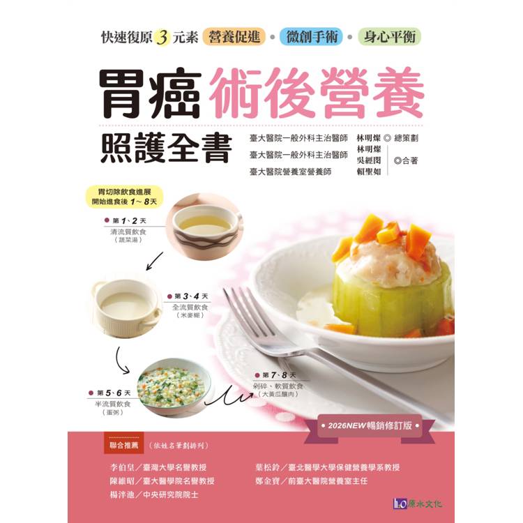 本書是臺大醫學院外科部教授林明燦醫師精心策劃,由附設醫院醫師和資深臨床營養師共同執筆,專門為胃癌術後病友量身訂作的進階飲食照護全書。涵蓋認識飲食與癌症的關係、胃部與胃癌、胃癌的診斷與檢查、胃癌的分期與治療、胃癌的飲食指導、胃切除後食譜做法、從營養談如何預防癌症復發、胃癌術後的管路照護、整合性癌症治療(包括生物基礎療法、身心靈介入療法、能量療法正確的胃癌手術飲食照護觀念)等,內容相當豐富、解說深入淺出,非常適合病人、照顧者、醫護藥營養社工相關工作者和學生、公衛保健教育人員、以及一般社會大眾等閱讀參考,相信可以有助於胃癌病人術後照護、減輕病苦、提升生活品質,與加速疾病康復。