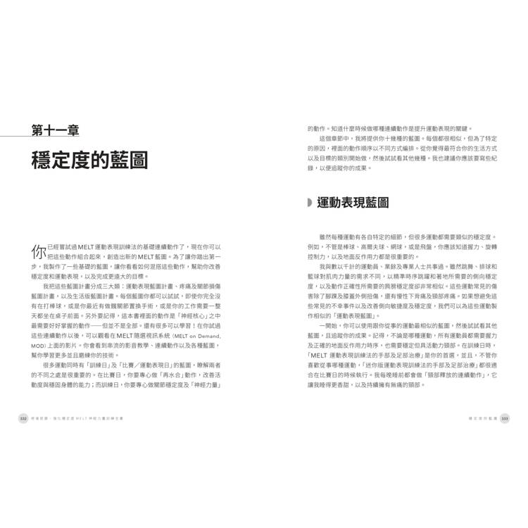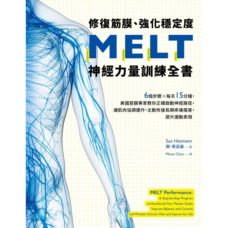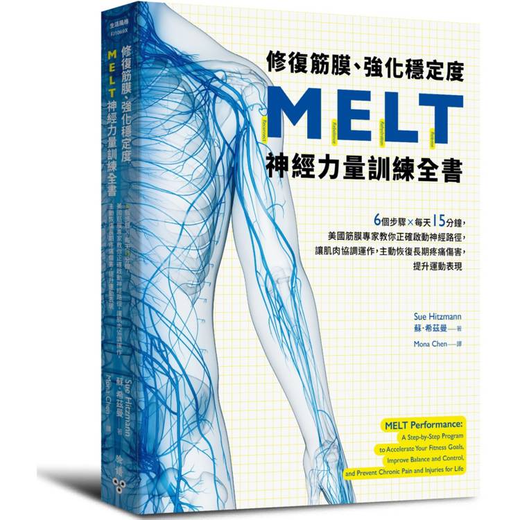 作者蘇.希茲曼所開發的MELT運動表現訓練法即是一套重建「神經力量」的自我照護方法。這套方法完整結合了筋膜、關節、神經、肌肉、穩定度與情緒等概念,你只需要透過6個步驟(重新連結、重新平衡、再水合、釋放、重新整合、重新設定),就能讓你建立起該有的「神經力量」,讓你表現得更好,並且減少傷害。