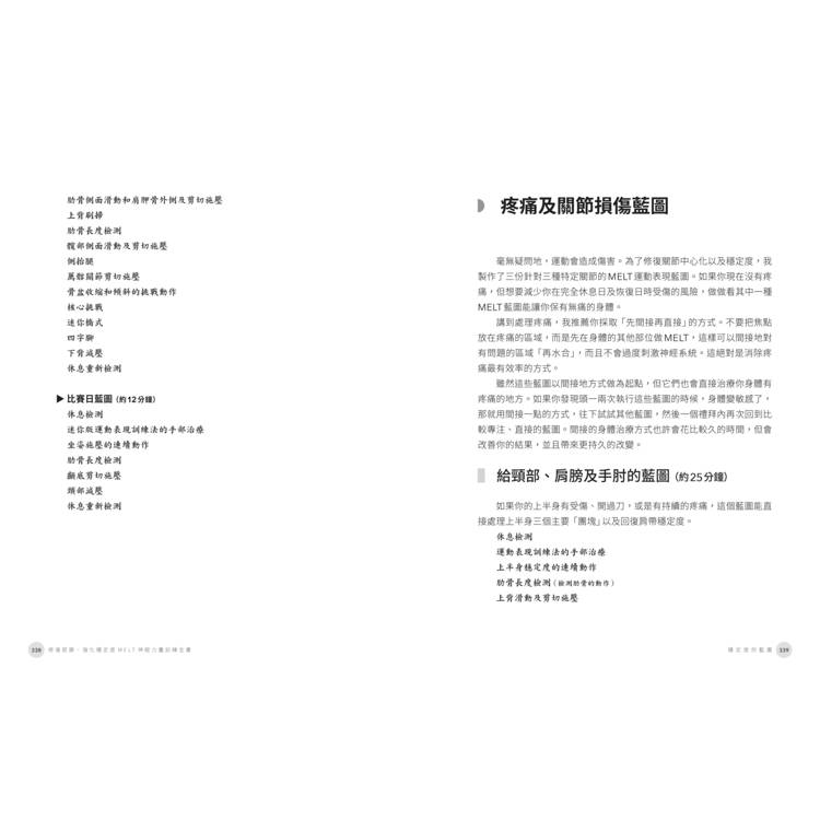 本書將透過步驟與圖解,帶你學習MELT運動表現訓練法的動作,並且用運動醫學的前端研究讓你瞭解這套方法的科學原理。此外,本書也提供適合不同生活型態讀者的MELT訓練課表,不論你是久坐少動的上班族、勞動工作者,抑或是運動愛好者或職業運動員,你只需要每天花15分鐘,就能獲得更好的生活與訓練品質。MELT運動表現訓練法綜合了作者30年的徒手治療經驗,至今已在16個國家影響了數千萬人。現在就打開本書,給你自己一次機會,迎接無痛且更美好的生活吧!