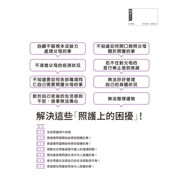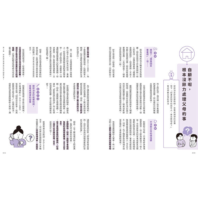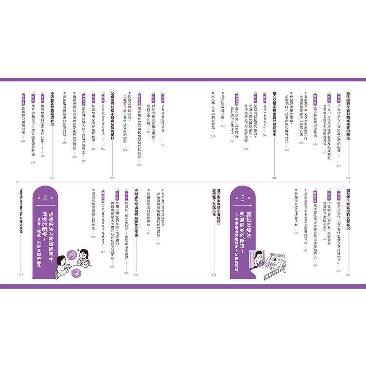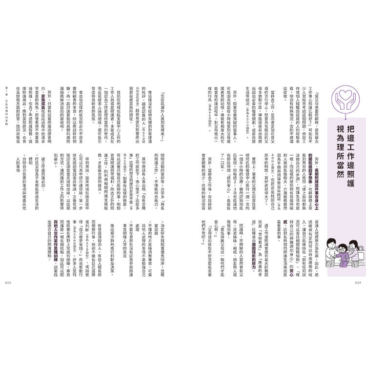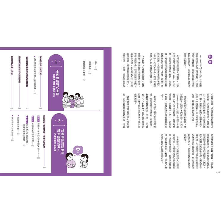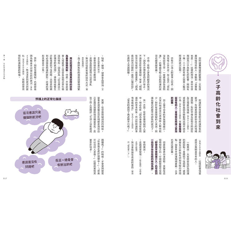 或許有些人會覺得照護生活還很遙遠,但是其實像是家人間的照料、外出時的陪伴等,都算是照護的一環,並不是要等到長輩真的倒下住院後才開始。尤其對有發展障礙的當事人可能會想,光照顧自己都自顧不暇,還要照護雙親根本是難上加難。但即便有發展障礙,只要用對方法,其實有很多困難都可迎刃而解。當問題發生時,如果能意識到「啊!這本書裡有提到這樣的狀況」就能冷靜下來,也更容易做出適當的判斷決策。