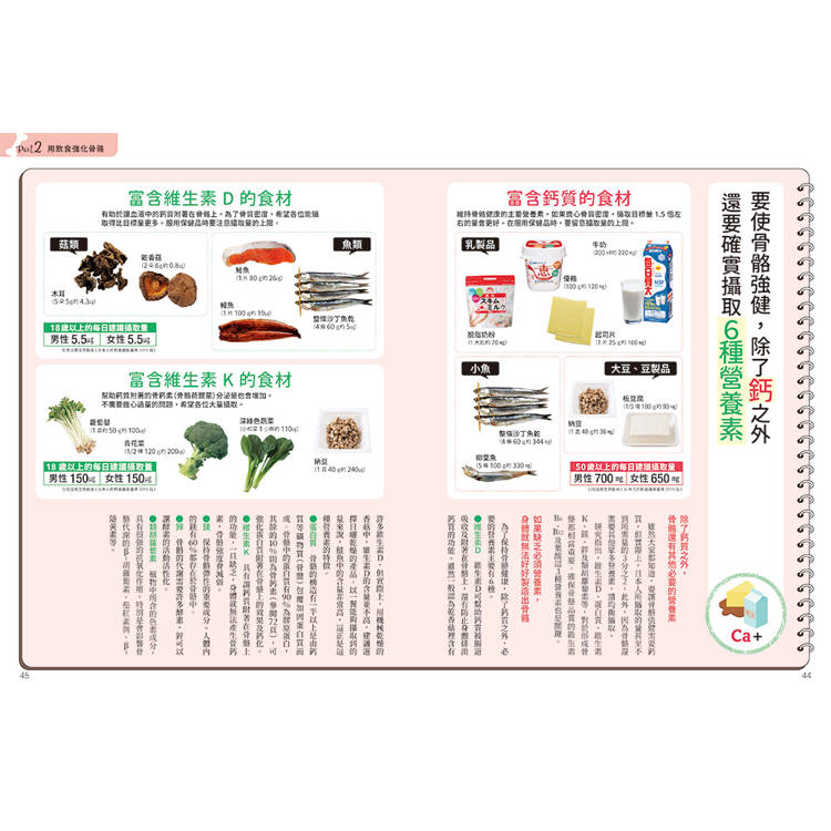 從小到大我們都知道,要補鈣需要多喝牛奶,但除了牛奶之外,還有許多食物都可以幫助骨骼,如:需要鈣則吃乳製品、小魚、豆製品;若需要維生素D,則吃菇類、魚類;若需要維生素K,則吃深綠色蔬菜、納豆、青花菜等……其他蛋白質、鎂、鋅也相當重要。