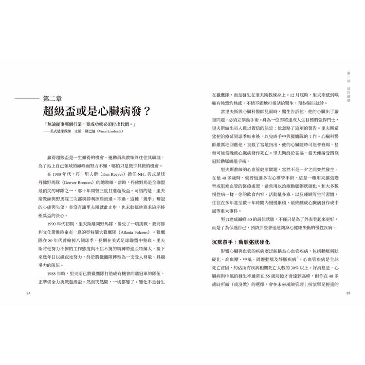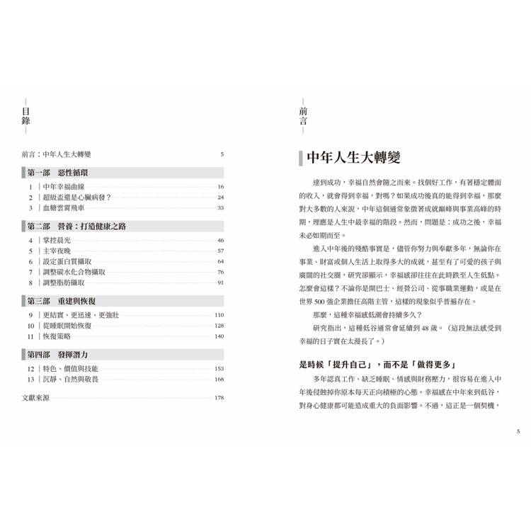 透過持之以恆的微小改變,就能累積出驚人的成果。不僅能改善血糖、降低高血壓、預防心臟病、減輕體重,更能讓你度快樂過中年關卡,展現出比年輕時更穩健的身體、更勻稱的身材,以及更敏銳的頭腦。同時強調,追求健康、苗條並非消除某些營養類別,而是根據個人需求改變它們;巧妙運用方法,讓人方便將運動引入自己的生活,而不會造成疼痛。本書以行為、習慣和心態為基礎,提供一個整體框架,幫助讀者重新校正生活方向,邁向健康和長壽的人生目標。