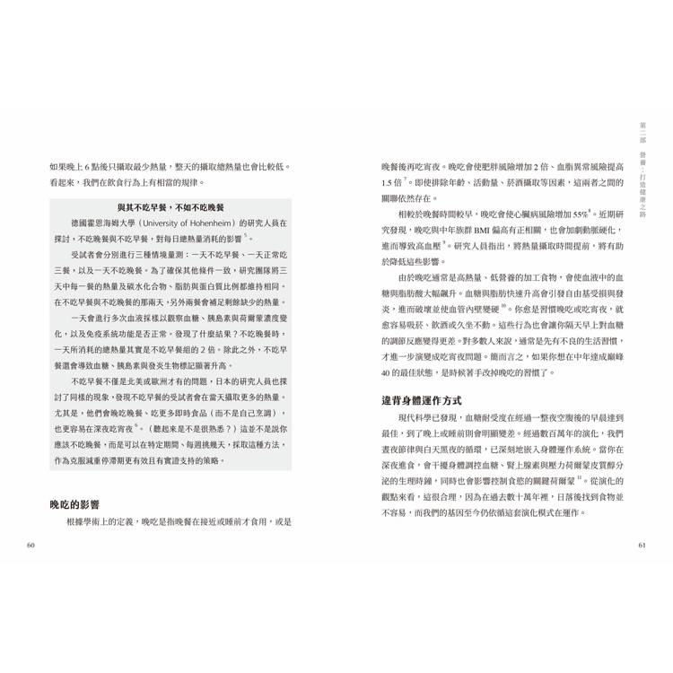 在第二部〈營養:打造健康之路〉中,你將會知道,改變營養相關的行為,遠比遵循某個飲食計畫更具影響力。你可以安然度過各種紛擾的間歇性斷食或限時進食(TRE)等飲食法,並探討不吃早餐是否比規律地吃早餐來得更好。你也將學到關於夜間進食的新科學、為何我們每天攝取的熱量有超過 40% 發生在晚上六點之後,以及一些簡單的技巧來抑制吃宵夜的衝動。接下來,你將瞭解蛋白質攝取對中年健康與表現的重要性,並進一步學習如何有效管理飲食中的碳水化合物與脂肪。培養良好的習慣是逆轉中年健康失衡與體重上升的關鍵。這同時也為長期成功奠定基礎,因為一旦養成習慣,就再也不需要每次都做「飲食選擇」,只要繼續依照原本的生活模式就好。