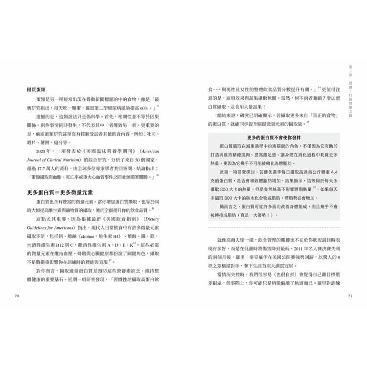 作者身為奧運選手運動營養顧問,同時也身為40+年齡層的中年人士,特別針對中年族群,提出飲食、睡眠、訓練類型和心態四大面向的客製計畫。