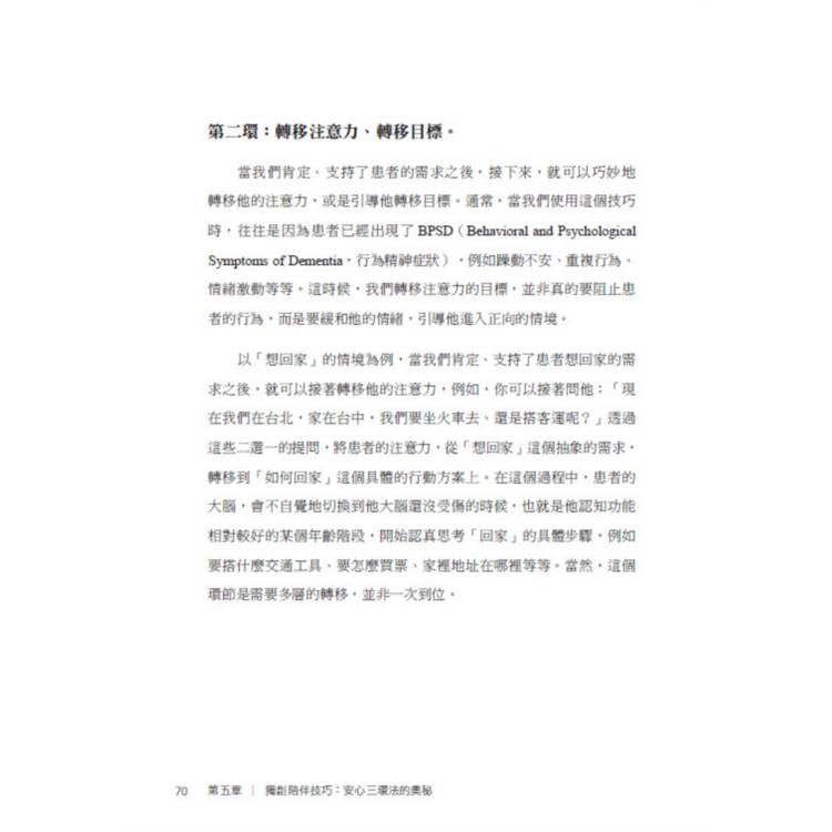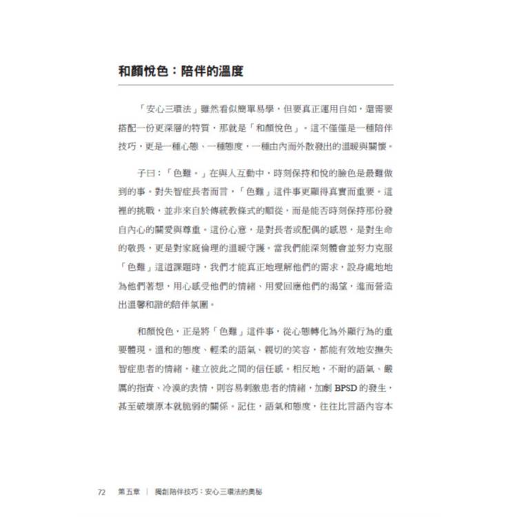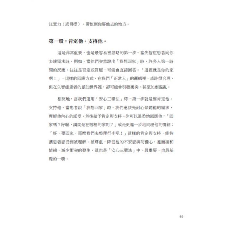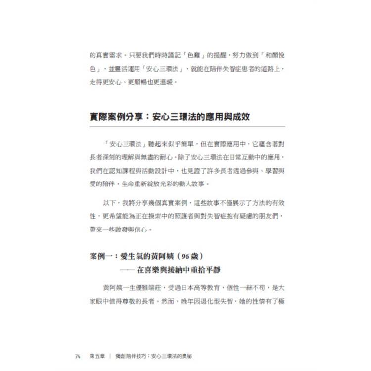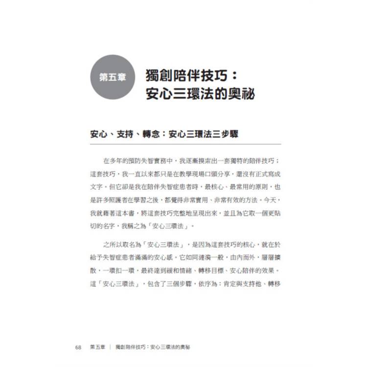 本書是一部結合生命故事、實證研究與實務方法的創新之作。書中不僅破除社會對失智症的迷思,更提出具體可行的解方,其中最具代表性者,便是作者多年實務淬鍊而成的「安心三環法」。這套方法不以控制為核心,而以安心、支持與轉念為軸心,重新定義陪伴的本質,讓照護回到理解與尊重,讓患者在能力退化中,依然能保有尊嚴與生活品質。