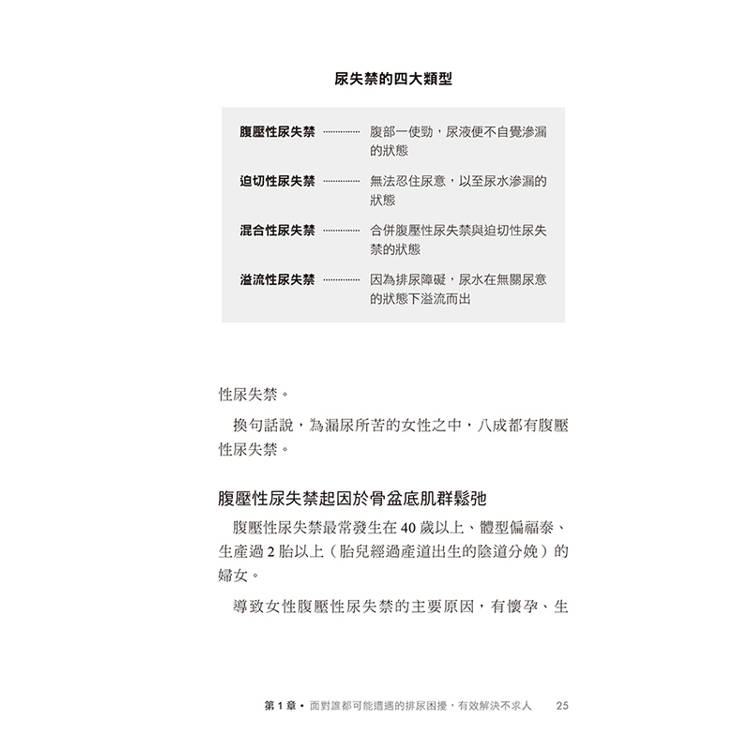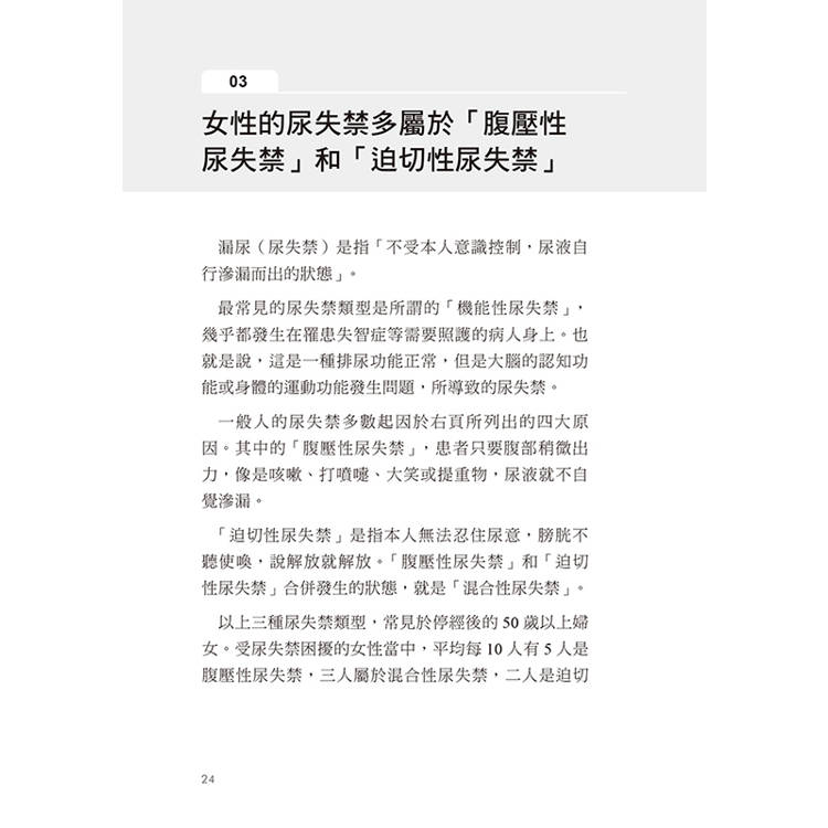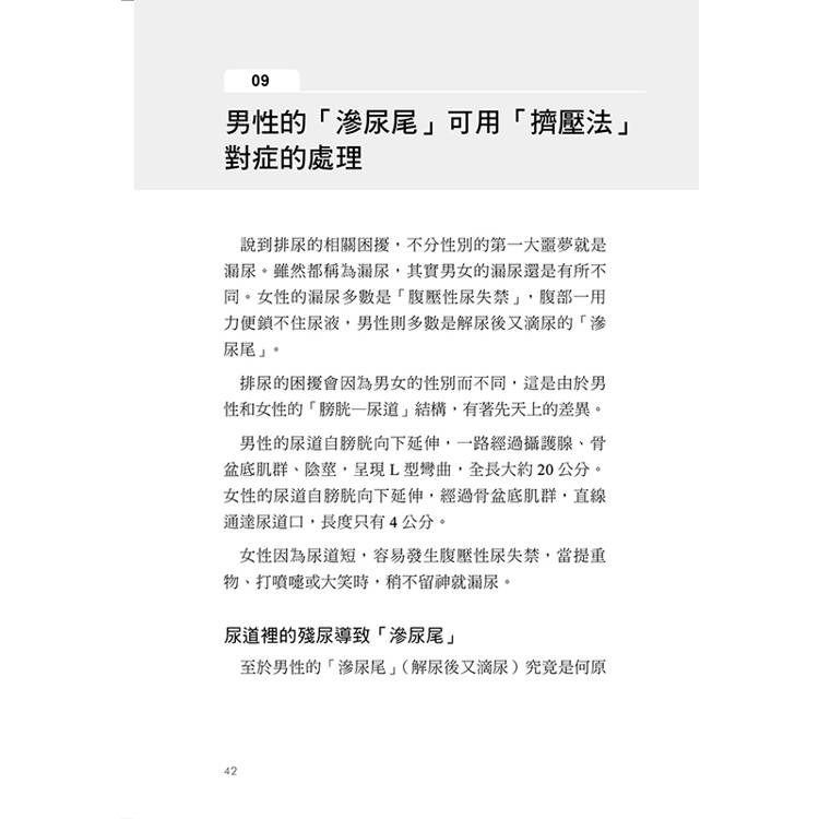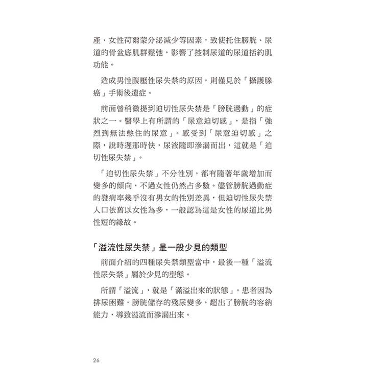 ★介紹最新醫療技術,對於攝護腺肥大、骨盆底肌障礙引發的泌尿相關問題與成因,均有深入淺出的詳盡剖析。