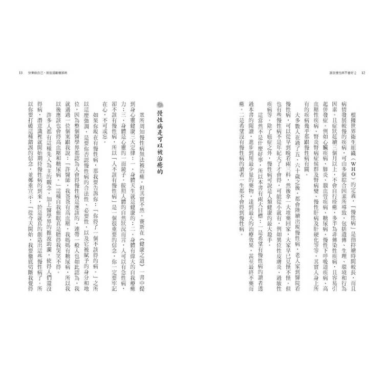 如果你現在有慢性病,那我要告訴你:「你得了一個不該得的病。」之所以這麼強調,是要你否認慢性病的合法性、必要性,以及它被賦予的身分和地位,因為整個醫學界都認為人會得慢性病是應該的,連帶一般人也如此認為,我就遇過一位個案跟我說:「許醫師,我爸爸有高血壓,我媽媽有糖尿病,所以我以後應該也會得高血壓和糖尿病。」這種自我催眠真是聽得我哭笑不得。
