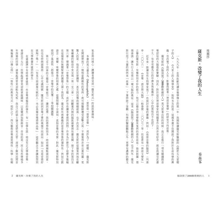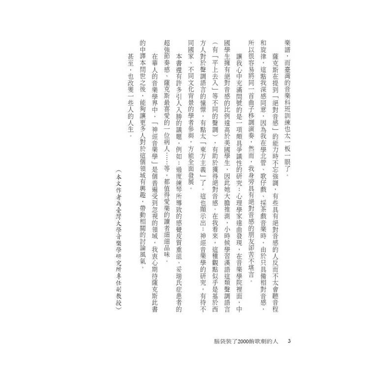 薩克斯寫的不只是行醫與科學研究的紀錄,他的文字更富含人文關懷、哲思與文學趣味……本書不僅可讓我們更進一步了解音樂那虛無飄渺又魅惑人心的魔力,也闡明人類心智的運作或異常是怎麼一回事。