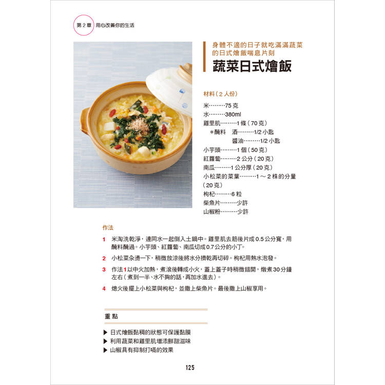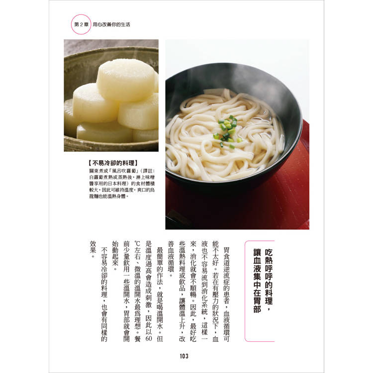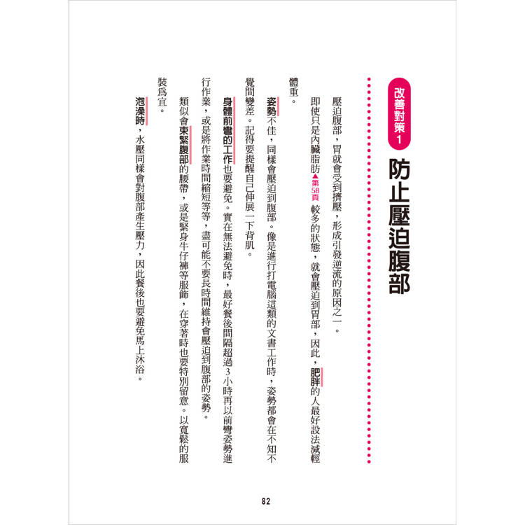 生活習慣方面,要防止壓迫腹部、側躺時「左側朝下」。運動方面,有矯正駝背、放鬆上半身肌肉、鍛鍊「橫膈膜」終止逆流、調整自律神經的16個呼吸方法和輕度運動,簡單好操作,容易落實於每一天。飲食方面,列出可以多食用的好食物、哪些是應該避免的地雷食物。還有外食菜色怎麼挑、有益消化&妨礙消化的烹調方式、7道美味的改善食譜等,教你利用正確知識,好好守護自己和家人。