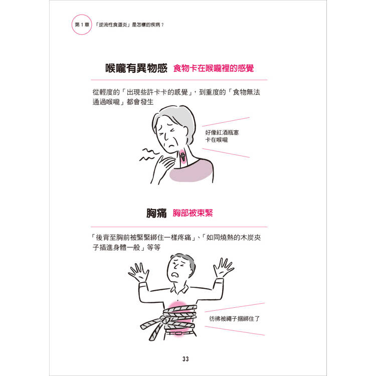 近幾年,我在門診常遇到其他專科醫師轉診過來的病患,有些病患是因為胸悶、胸痛去心臟科求診,有些因為長期咳嗽去看胸腔科,有些則是因為吞東西時,覺得喉嚨卡卡的去找耳鼻喉科求助,經過各專科醫師詳細檢查,卻沒發現什麼異狀,於是轉診到胃腸科,看看是不是有胃食道逆流的問題。病患往往會很訝異地詢問我:「我都不會感覺到胃痛耶!也不覺得有酸水湧上來,這樣也算胃食道逆流嗎?」我會向病患解釋:「典型的胃食道逆流症狀,是有胃酸逆流到胸口、甚至嘴巴,胸口會有灼熱感,不過有些病患是非典型的症狀,是以胸痛、咳嗽或是喉嚨有異物感來表現,需要進一步檢查,才能確定是不是這個疾病。」有些病患做了胃鏡檢查,果然在胃和食道交接處發現好幾道黏膜損傷,證實是胃食道逆流症,在接受藥物治療後,原本擾人的症狀都消失了。究竟胃食道逆流有哪些症狀,可以參考本書做進一步的了解。