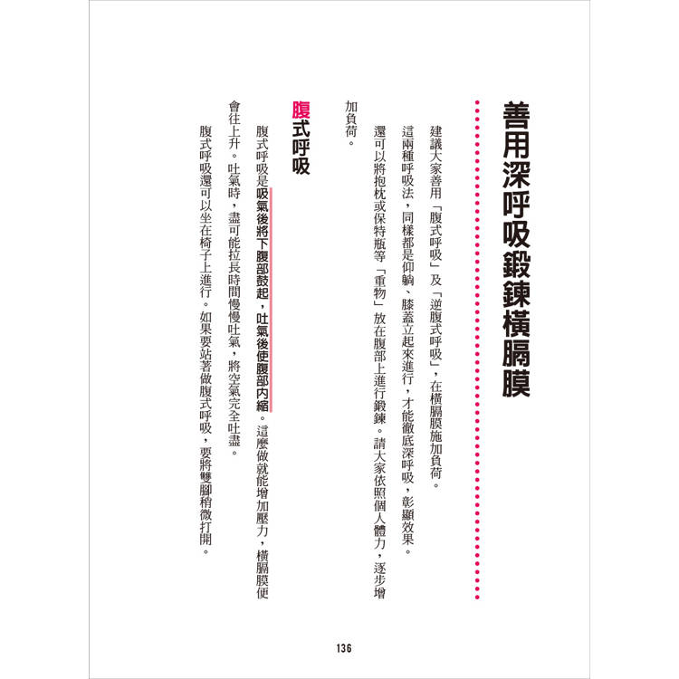 我覺得這本書最值得推薦的,就是「吃什麼、怎麼吃?」的部分,多數人就是想知道哪些是地雷食物、NG食物,還有哪些食物應該要積極攝取。這本書從食材的挑選到烹飪的方式,提供了詳盡的飲食建議,如果有記不清楚的地方,隨時可以拿起來翻一翻,是一本很實用的保養腸胃工具書。另外,本書有提到可以鍛鍊「橫膈膜」來中止逆流,利用「腹式呼吸」的方式使下食道括約肌保持在正確的位置,這個方法我建議大家嘗試練習看看。