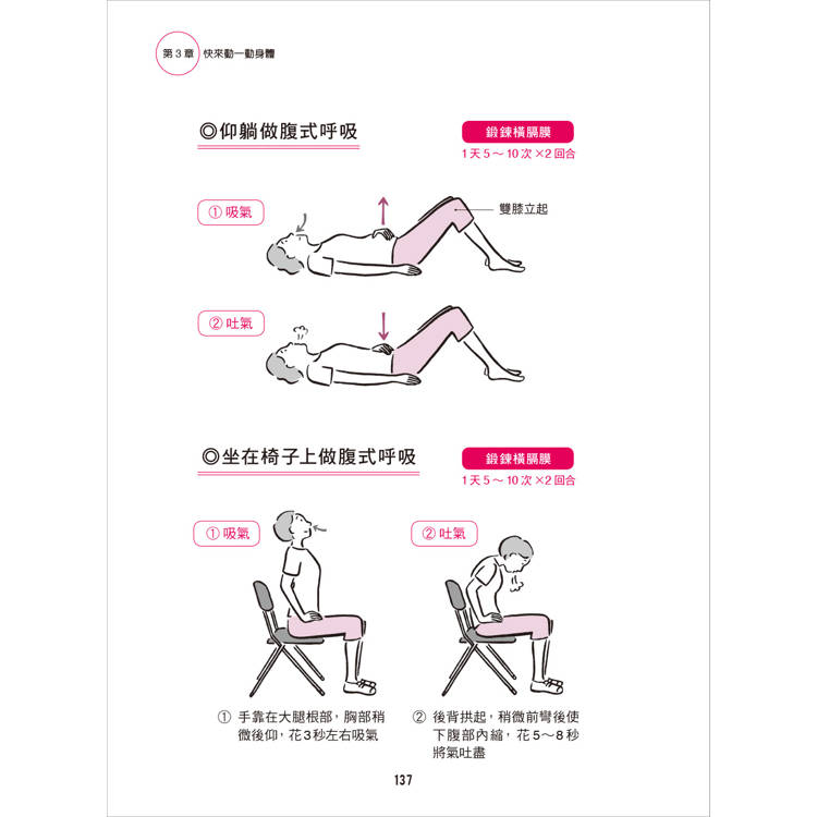 ⊙以腹式呼吸和輕度運動鍛鍊橫膈膜:16個呼吸&運動,使下食道括約肌保持在正確的位置,活化橫膈膜功能,調節自律神經,緩解逆流症狀。