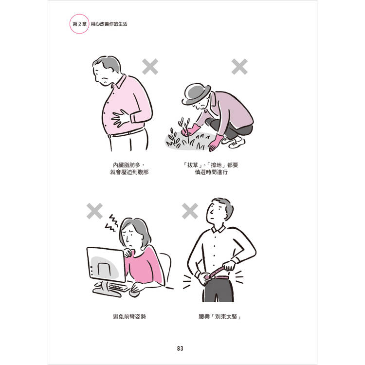 ⊙防止壓迫腹部:長時間打電腦時,姿勢都會在不知不覺間變差,記得伸展一下背肌。水壓會對腹部產生壓力,餐後要避免馬上沐浴。