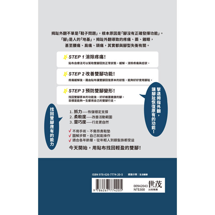 本書作者累積超過七萬名患者的臨床經驗,提出一套簡單、安全、人人都能在家操作的「貼布自療法」。不用手術、不靠昂貴矯正器,只要貼布,就能改善足部功能,重拾自在步伐。
