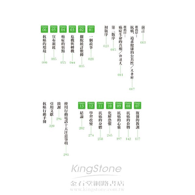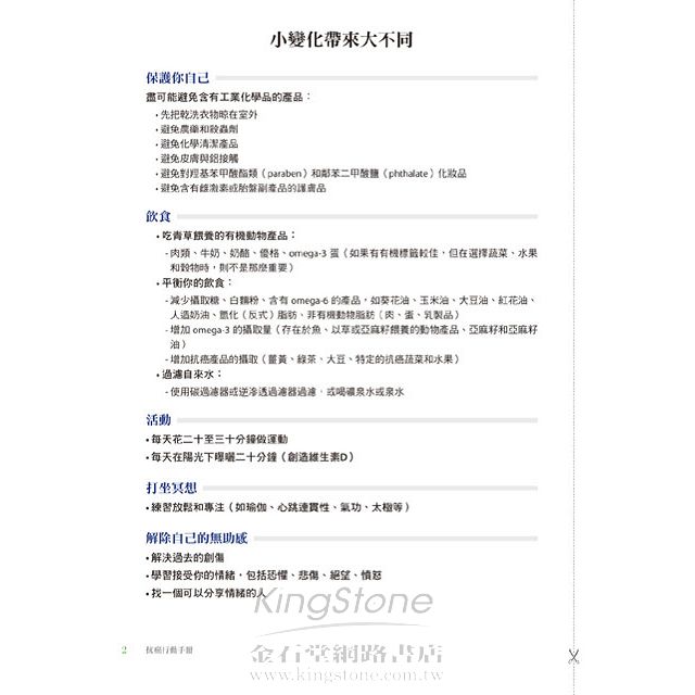 本書內容經過細心求證,深入淺出,是抗癌病患以及任何想採取健康生活型態以防癌者不可或缺的指南。