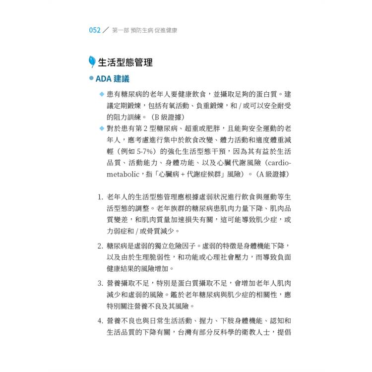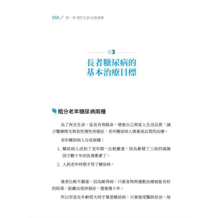 第一部〈預防生病 促進健康〉,奠定了全書的基礎。洪醫師提醒我們,在超高齡社會中,糖尿病、高血壓、高血脂症等「三高」疾病是影響長者健康的關鍵,必須認真看待,並且積極協同治療,以預防併發症,減少失能。最好能定期篩檢,以做到二級預防「早發現、早治療」,甚至是一級預防「未病先防治」。