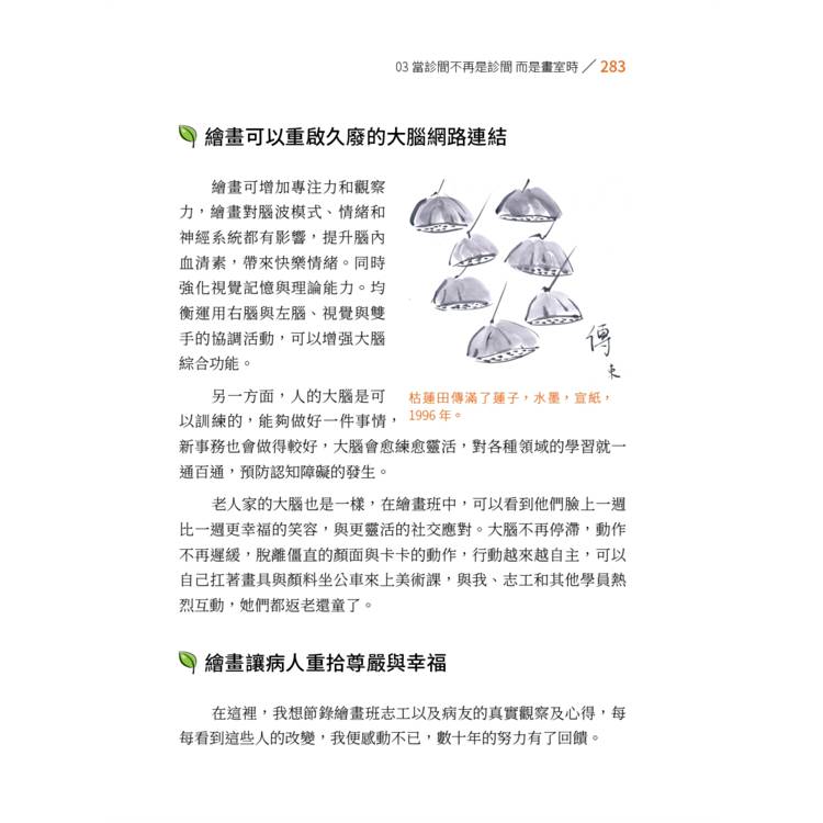 從享受美食、聽音樂、參加繪畫班並舉辦畫展的經驗,讓老年病人能夠擺脫孤寂,忘卻憂鬱,更充分表現自己,表達真善美,超越老人學上的「成功老化」。