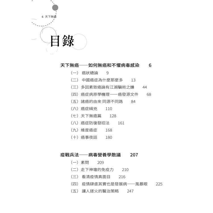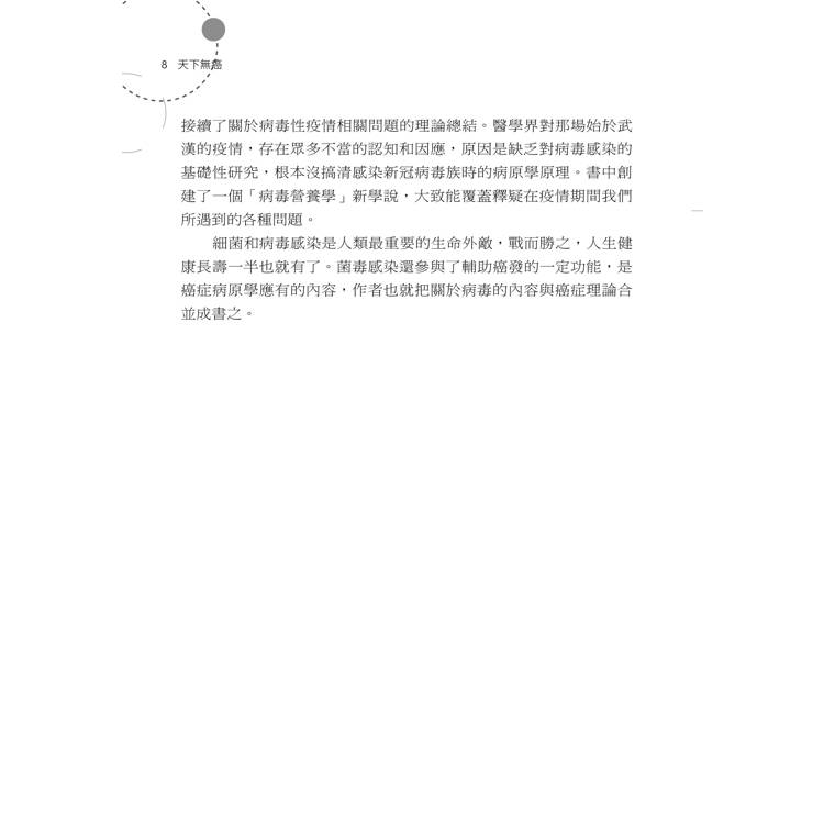 細菌和病毒感染是人類最重要的生命外敵,戰而勝之,人生健康長壽一半也就有了。菌毒感染還參與了輔助癌發的一定功能,是癌症病原學應有的內容,作者也就把關於病毒的內容與癌症理論合並成書之。