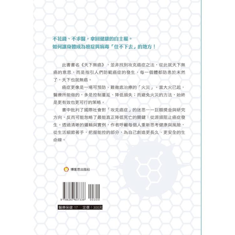 在本書作者眼中,癌症的病發原因並不複雜,大道至簡,也因此把書名定為天下無癌。但要命的是,在人的江湖裡,至簡的問題往往被人為搞複雜。作為動物的人類有太多個體聽不得也聽不進飲食要限制的忠告,醫學界則有意無意擾亂視聽謀利,商家、廠家以及各種媒體為了利益,鋪天蓋地宣傳營養美食。人們要避免中槍不入癌門,要麼得有良好的飲食習慣,要麼得有相當的認知和意志。本書闡析指出,控制營養攝入,體細胞就無癌變的機會,每人都做到不生癌,天下也就無癌。當然,天下無癌只是一種理想狀態。屬於動物的人類,要做到一生飲食有度,需要相當的智力和毅力。何況有那麼多為癌症患者遮掩錯誤的流行理論。