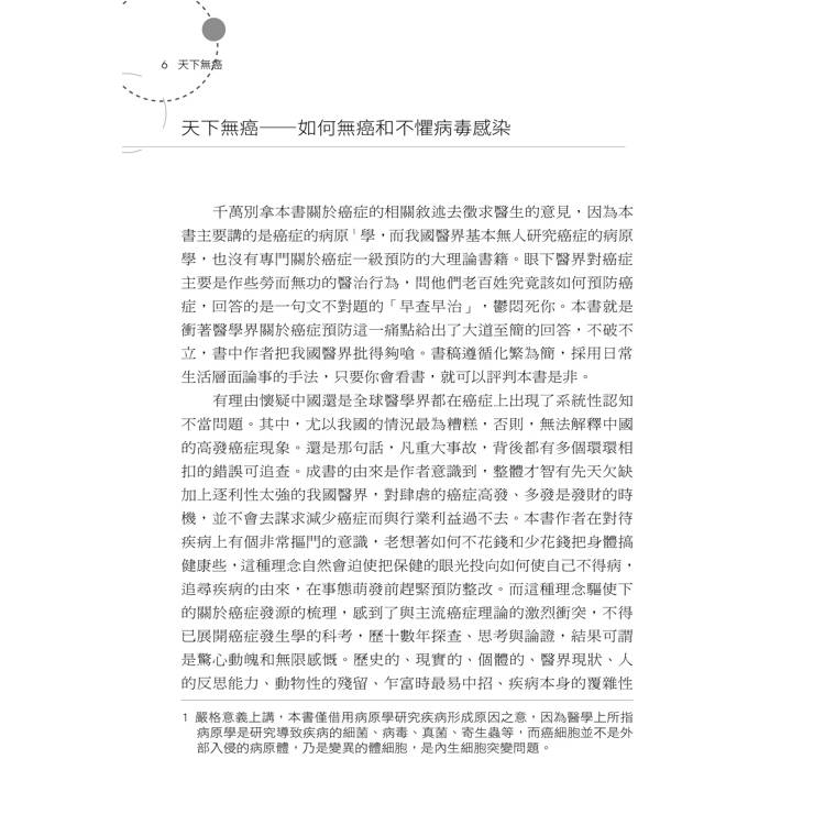 千萬別拿本書關於癌症的相關敘述去徵求醫生的意見,因為本書主要講的是癌症的病原 學,而我國醫界基本無人研究癌症的病原學,也沒有專門關於癌症一級預防的大理論書籍。眼下醫界對癌症主要是作些勞而無功的醫治行為,問他們老百姓究竟該如何預防癌症,回答的是一句文不對題的「早查早治」,鬱悶死你。本書就是衝著醫學界關於癌症預防這一痛點給出了大道至簡的回答,不破不立,書中作者把我國醫界批得夠嗆。書稿遵循化繁為簡,採用日常生活層面論事的手法,只要你會看書,就可以評判本書是非。