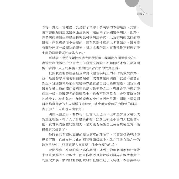 有理由懷疑中國還是全球醫學界都在癌症上出現了系統性認知不當問題。其中,尤以我國的情況最為糟糕,否則,無法解釋中國的高發癌症現象。還是那句話,凡重大事故,背後都有多個環環相扣的錯誤可追查。成書的由來是作者意識到,整體才智有先天欠缺加上逐利性太強的我國醫界,對肆虐的癌症高發、多發是發財的時機,並不會去謀求減少癌症而與行業利益過不去。本書作者在對待疾病上有個非常摳門的意識,老想著如何不花錢和少花錢把身體搞健康些,這種理念自然會迫使把保健的眼光投向如何使自己不得病,追尋疾病的由來,在事態萌發前趕緊預防整改。而這種理念驅使下的關於癌症發源的梳理,感到了與主流癌症理論的激烈衝突,不得已展開癌症發生學的科考,歷十數年探查、思考與論證,結果可謂是驚心動魄和無限感慨。歷史的、現實的、個體的、醫界現狀、人的反思能力、動物性的殘留、乍富時最易中招、疾病本身的覆雜性等等,實是一言難盡,於是有了洋洋十多萬字的本書癌論。其實,說本書觀點與主流醫學產生衝突,還抬舉了我國醫學現狀,因為,許多疾病的發生學緣由探究也可稱病源研究,以及疾病的流行病學研究,在我國是很少去搞的,這在代謝性疾病上尤其如此。醫界沒有關於癌症一級預防的研究,所以本書所述,實際都找不到癌症發生學的醫學體系性表述去PK。