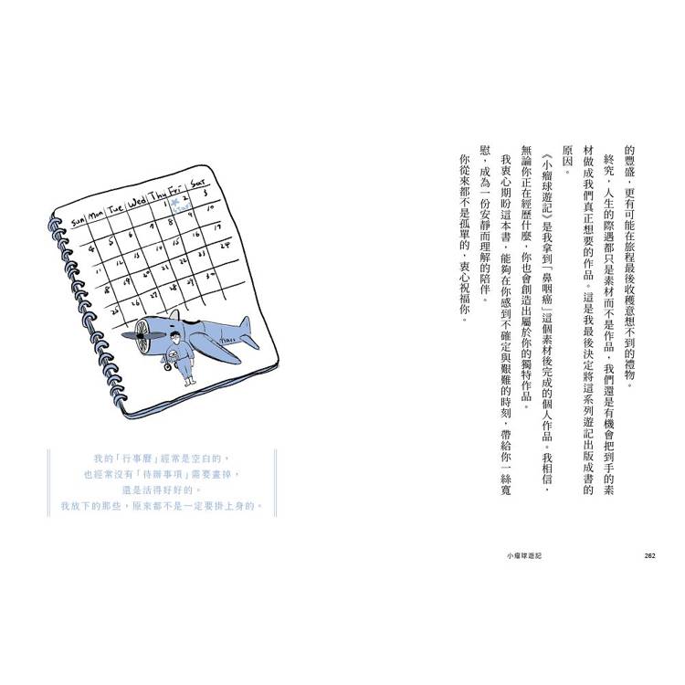 後來我意識到,這場病不是一次戰役,而是一趟旅程。我沒有什麼要對抗,我只要好好去感受,去愛惜我那需要修復的身體就可以。於是我把「戰記」改成「遊記」,給我的腫瘤取了一個諧音名「小瘤球」,開始在臉書上分享「小瘤球遊記」。我記錄經歷過的每一種檢查、診療、放療與化療、身體與心情的變化,以及我從中獲得的體悟。