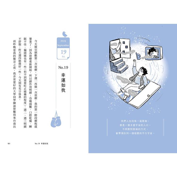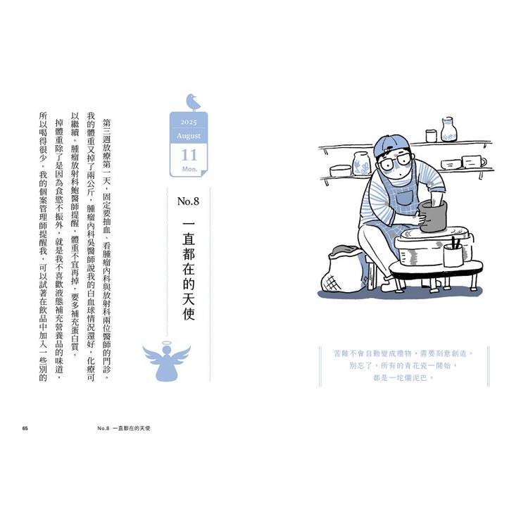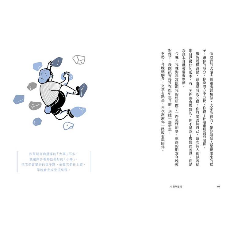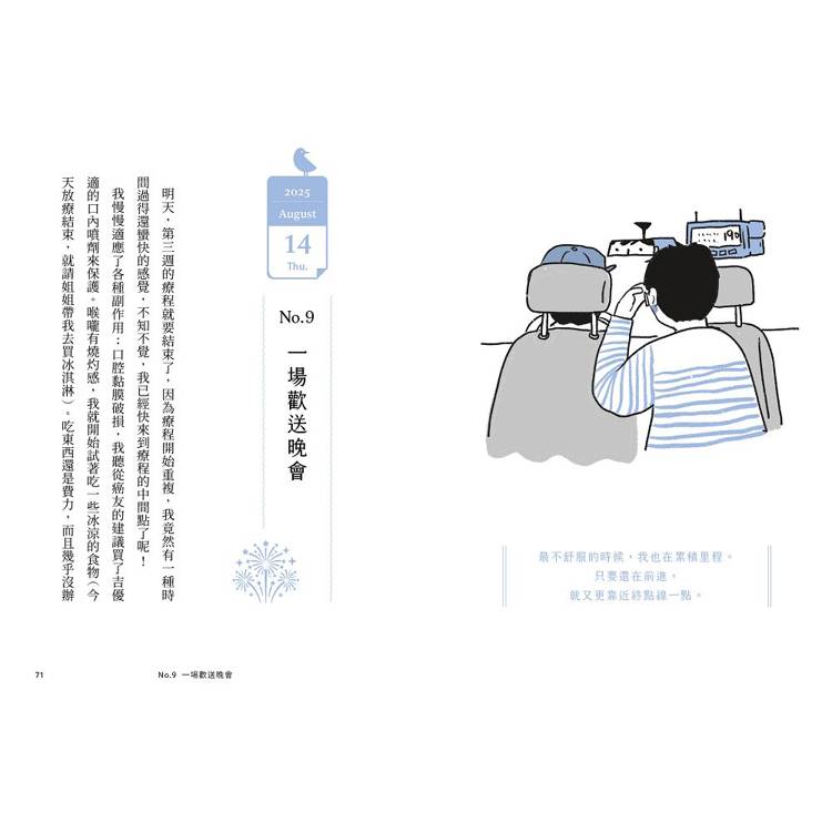 癌細胞成了「門鈴按得有點大聲」的信差,帶來善待自己的提醒;放療點滴像「諾曼第大空降」、帶狀皰疹成為「獲獎緞帶」;味覺異常讓他「神農嚐百草」,甚至修得「清心寡慾」境界⋯⋯彷彿登上一座已有前人闢徑的高山,以日常美好為支點攀爬,終能完美登頂。