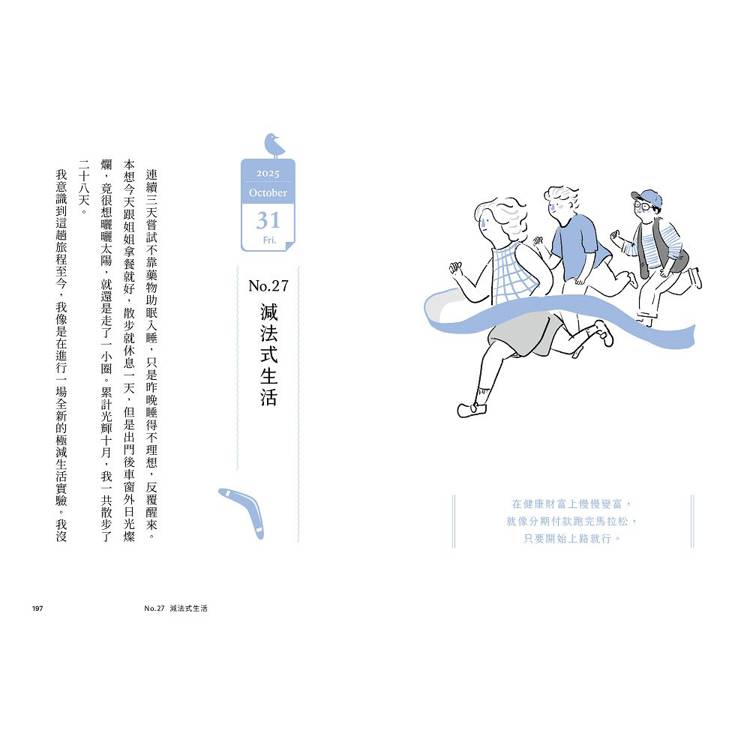 面對生命的無常,是人一生最重要的修行,而這本書讓生死議題不再抽象。它示範了「苦難的轉化」,它教會我們如何清晰地看見,自嘲而不自憐,感謝而不抱怨,用感恩、健身、幽默來陪伴自己。