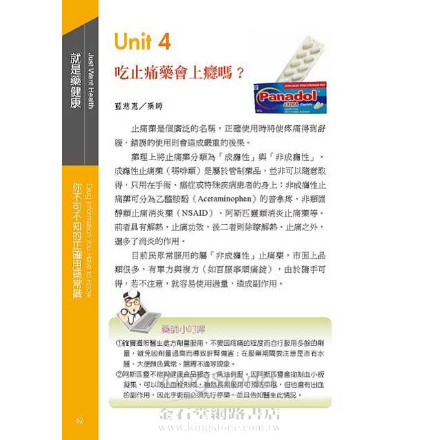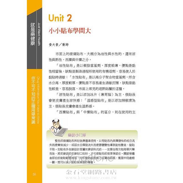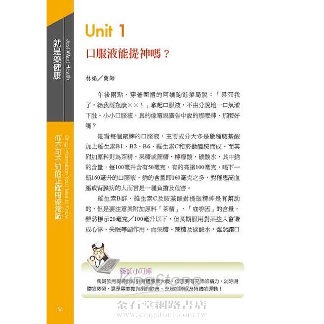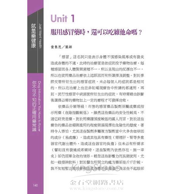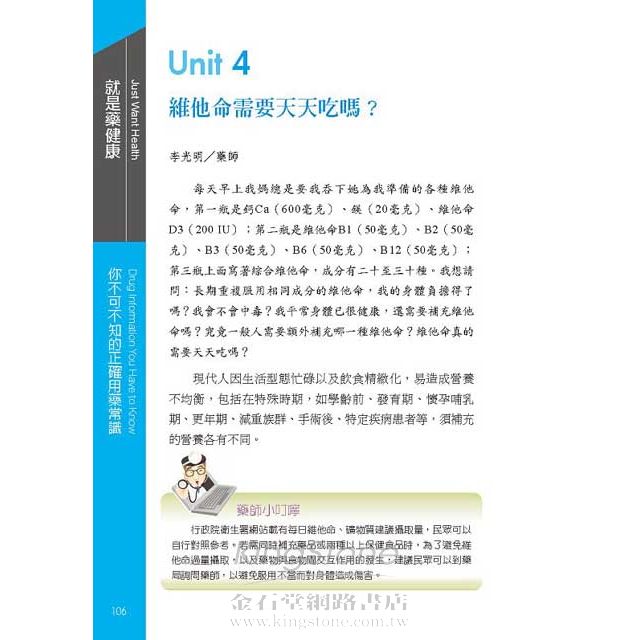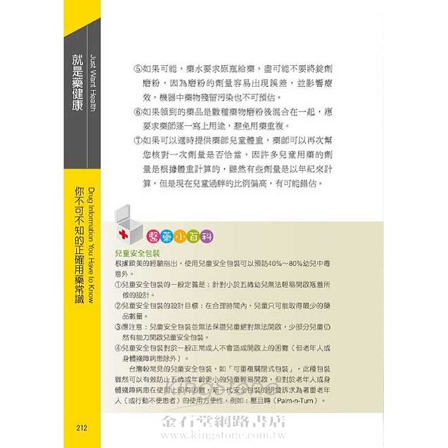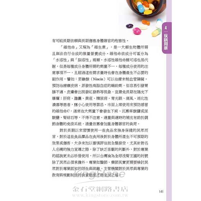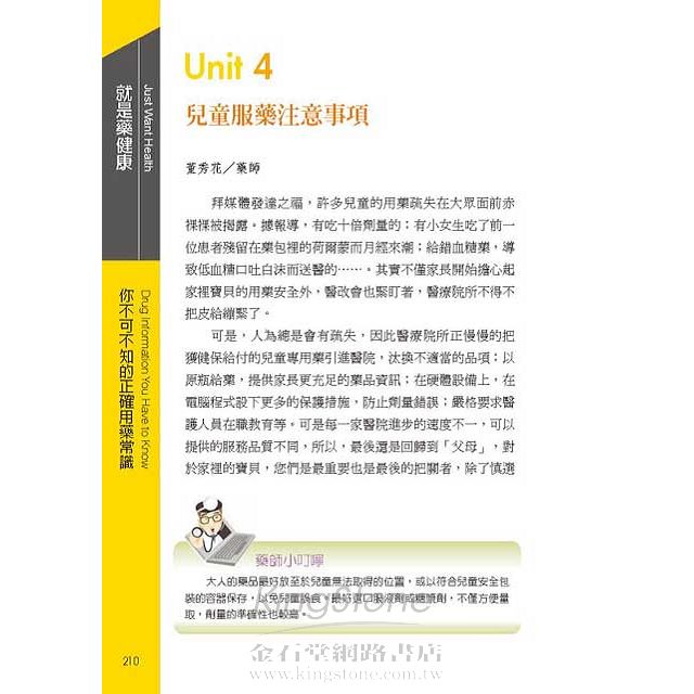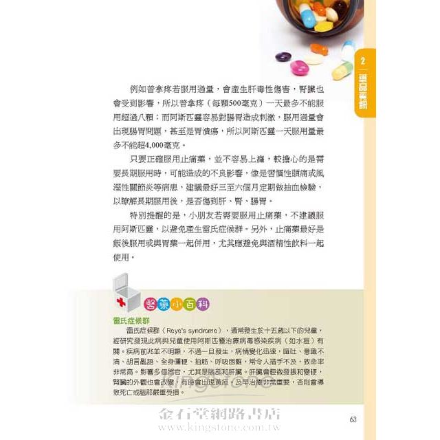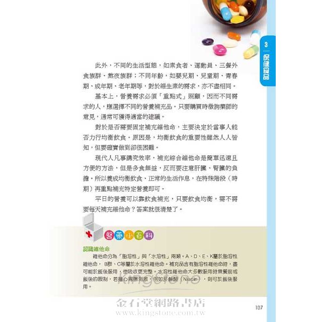 本書內容包括基本用藥知識、常見疾病用藥及預防保健知識,並針對小孩、孕婦、婦女、老年人、慢性病患等不同族群的用藥需求詳加說明;還有時下最熱門的戒菸、美容、中草藥、食品保健等問題的討論;再搭配「藥師小叮嚀」和「醫藥小百科」,從貼心的叮嚀與關懷中,幫助民眾建立正確的用藥觀念。內容豐富,精湛實用,可作為民眾正確用藥的輔助工具,更是一本難得的家庭必備安全用藥手冊。