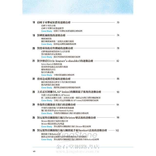 書中記載了當物理治療師負責一個病例時,所該擁有的整形外科‧關節解剖的基本知識,並搭配實際範例進行解說,從一開始的治療方針、到運動治療經過,以及最後成效都有紀錄。書末以附錄的形式,記載依據觀察與研究病例所得到的現象,去思考臨床上的治療處方,並且提示關於疾患的知識重點。其中,如果是特別的手術,會記載術式;如果疾患有什麼特徵,則會針對特徵加以描述。