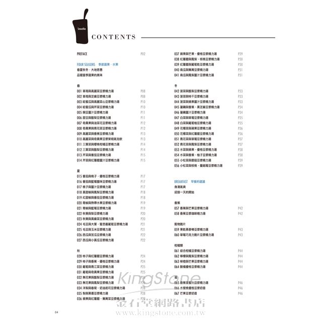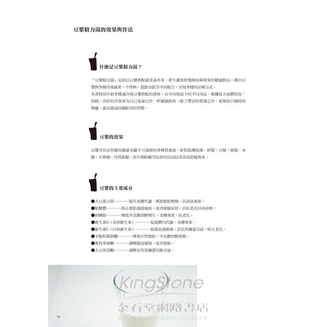 本書介紹多種可有效舒緩症狀的豆漿精力湯,針對在改善成不易復胖體質的塑身、減重過程中,容易產生肌膚乾燥與便秘問題,以及焦慮不安的情緒反應。只要將食材放入調理機裡攪拌,即可輕鬆攝取多樣蔬菜、水果的養份。睡眠時無形中過度流失的水份,藉由飲用豆奶精力湯提升蔬菜、水果中的維生素與礦物質的吸收效率。豆漿中含有豐富植物性蛋白質,能維持舒適的飽足感。就讓滿滿一杯的精力湯,開啟美好的一天吧。