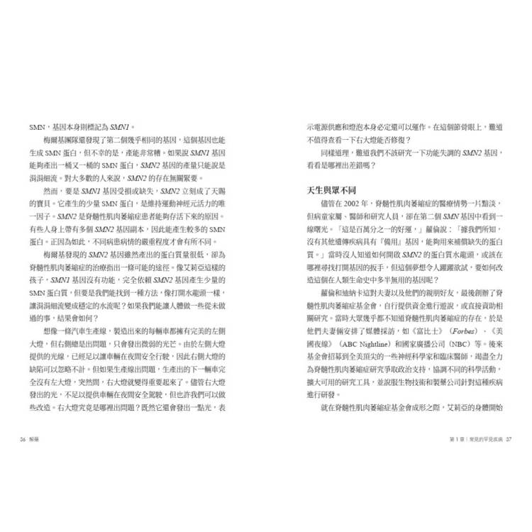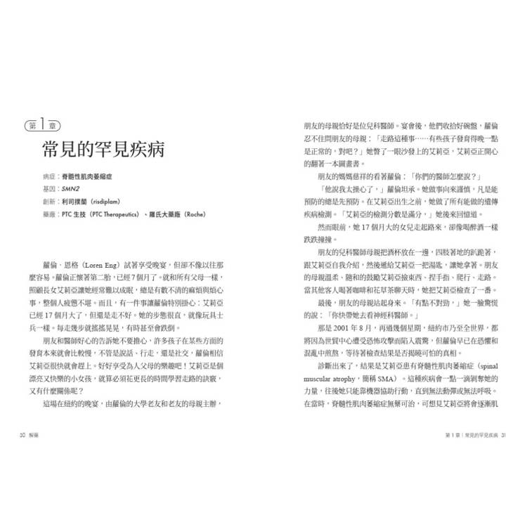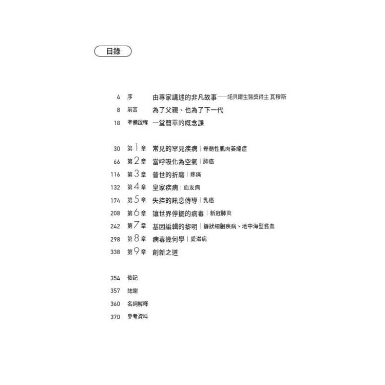 如果想鼓勵下一代加入對抗癌症及老年失智症的行列,或準備好應對下一次的流行性疾病,就需要挖掘並分享經典的科學創新過程中那些無名英雄的故事。所以接下來請跟我著,一起深入探索八種藥物的研發冒險之旅。我們將明白,為什麼目前世界上最多人使用的藥物乙醯胺酚(paracetamol,普拿疼的主成分),在最初發現後的數十年間,一直被束之高閣;從一位病童毅力非凡的母親身上,看到少數人如何憑藉決心和動力,推動創新;巧妙修改免疫系統的一部分,如何促成突破,將血友病患者解放出來,不再需要過著幾乎每天輸血的痛苦生活;子宮內胎兒才擁有的血液,如何在成人體內被喚醒,用以治療鐮狀細胞貧血症;對錐體幾何的熱情,如何通往治療愛滋病的新方法;肆虐全球的大流行,如何促使研究者在破紀錄的短時間內,研發出抗病毒藥物;還有,針對特定基因標靶的新療法,又是如何延長了癌症患者的生命。