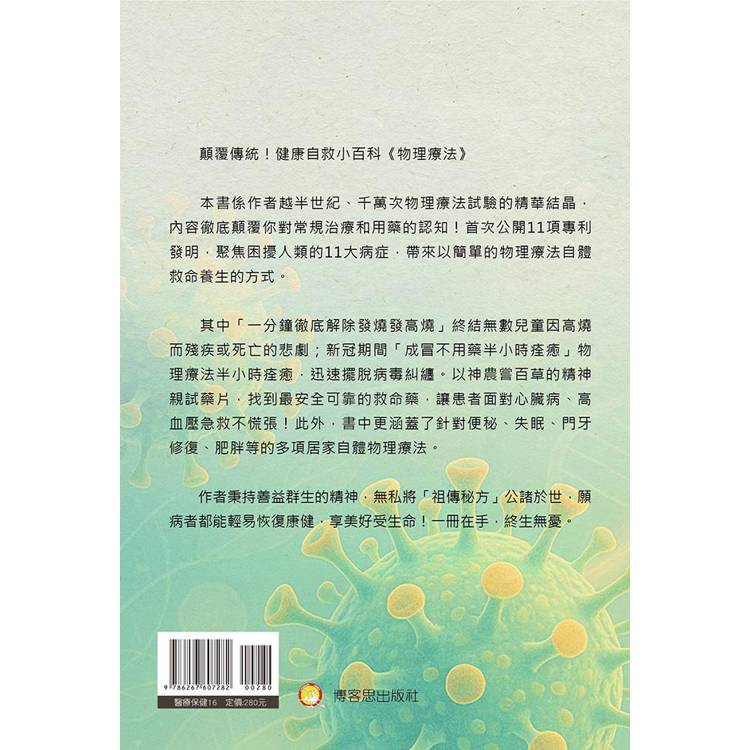 《物理療法》所關注的,多為人們生活中反覆出現、卻容易被忽視的健康困擾,如感冒、發燒、失眠、腸道不適、體重管理、過敏反應與日常保健等。作者透過自身研究與觀察經驗,提醒讀者重視生活習慣、環境因素與身心狀態對健康的長期影響。本書並不否定醫療專業的必要性,而是指出:在專業醫療介入之前與之後,物理性的生活調整與身體照護,往往扮演關鍵卻被低估的角色。這樣的觀點,使物理療法成為現代健康觀中不可或缺的一環。