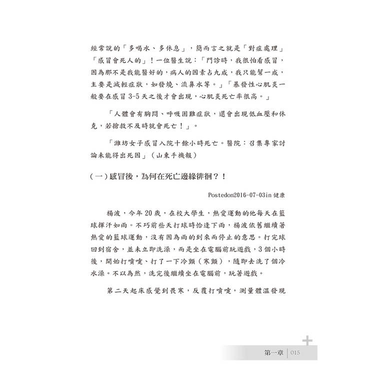「目前常見感冒日久未癒出現的胸悶、心慌、頭暈、暈厥等症狀,只有及時到醫院就診,才能確診感冒過後出現的病毒性心肌炎。」「病毒性心肌炎,係由病毒感染所致的局限性或彌散性心肌炎性病變,大多數都可以自癒,有極少數人會演變成擴張型心肌病,導致心力衰竭甚至是心源性猝死。在兒童以及40歲以下的中年人群中比較常見,35%集中在10-30歲人群中。」感冒藥有成百上千種,但是沒有一種真正特效藥。安慰作用更多一些。這些年許多人感冒了,濫買藥、濫打點滴、濫用抗生素。副作用比作用還要大。(據中國安全注射聯盟統計,我國每年因不安全注射導致死亡的人數在39萬以上)「市面上常見的感冒藥例如:新康泰克、泰諾感冒片、日夜百服嚀、感康片、白加黑、快克等等。大家可以自己看看這些藥物的成分,其實相差無幾,無非都是氯苯那敏(緩解鼻塞、打噴嚏)、對乙醯氨基酚(退熱、止痛)等這些成分。」「由於感冒目前尚無特效的抗病毒藥物,故予對症治療、緩解感冒症狀為主,同時注意休息,適當補充水分、保持室內空氣流通、避免細菌感染。」,所以醫生經常說的「多喝水、多休息」,簡而言之就是「對症處理」「感冒會死人的」!一位醫生說:「門診時,我很怕看感冒,因為那不是我能醫好的,病人的因素占九成,我只能幫一成,主要是減輕症狀,如發燒、流鼻水等。」「暴發性心肌炎一般要在感冒3-5天之後才會出現,心肌炎死亡率很高。」