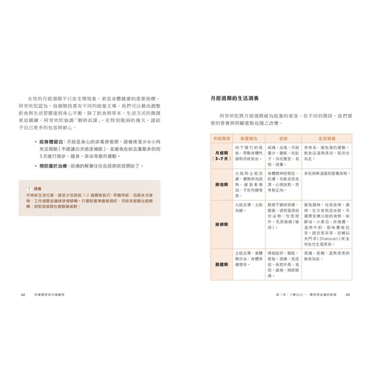 作者以自身經驗為證,從長年經期劇痛、偏頭痛、焦慮失眠,到藉由阿育吠陀重啟身心平衡,
