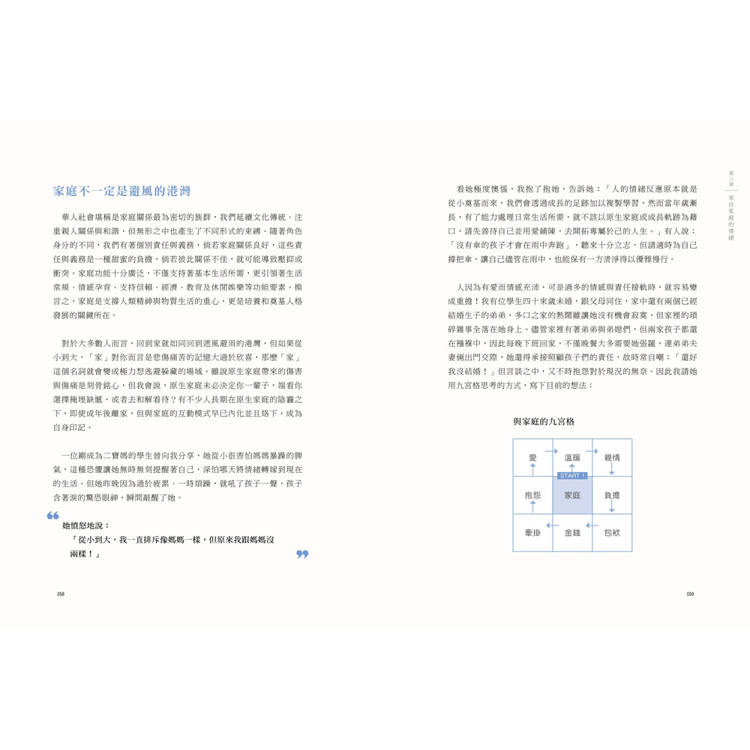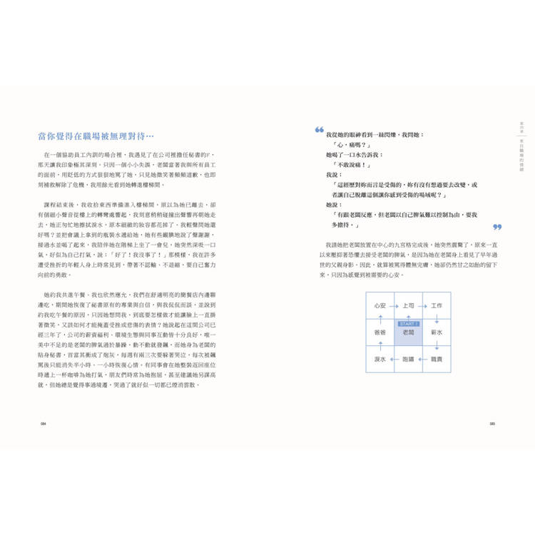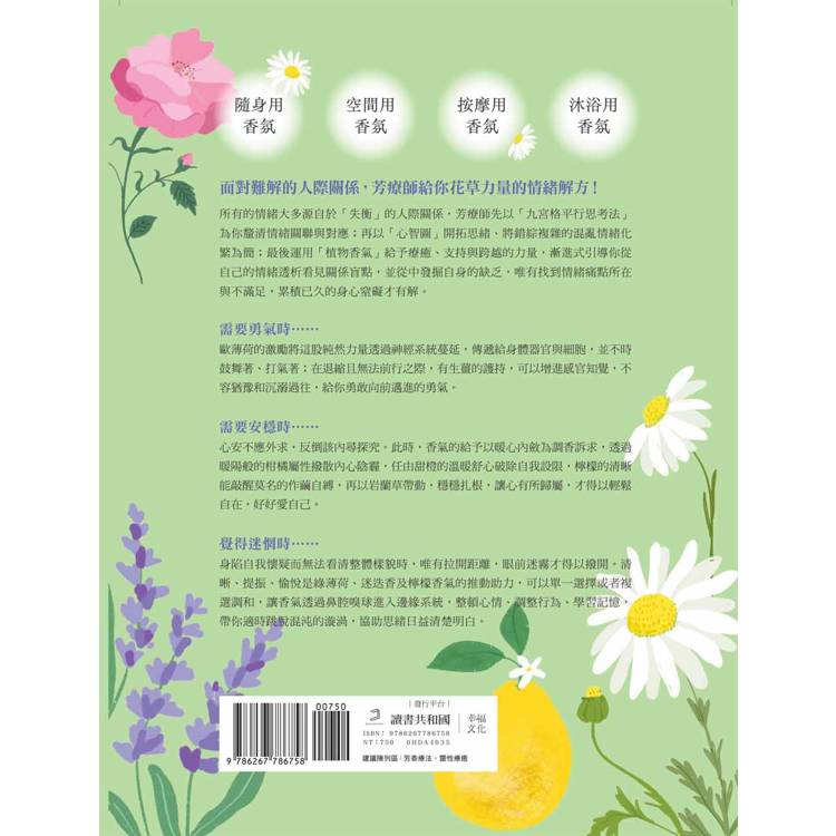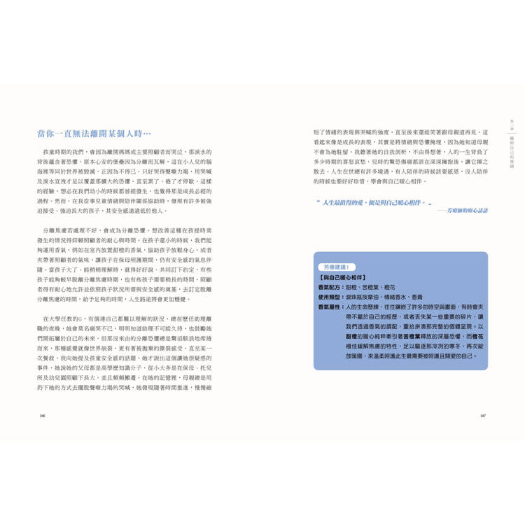 所有的情緒,大多源自於「失衡」的關係,芳療師先以「九宮格平行思考法」為你釐清情緒關聯與對應;再以「心智圖」開拓思緒、將錯綜混亂的情緒化繁為簡;最後運用「植物香氣」給予療癒、支持與跨越的力量,漸進式引導你從自己的情緒透析看見關係的扭曲,進而從關係的扭曲發掘自己的缺乏,唯有找到情緒痛點的所在之處與不滿足,累積已久的身心窒礙才有解。