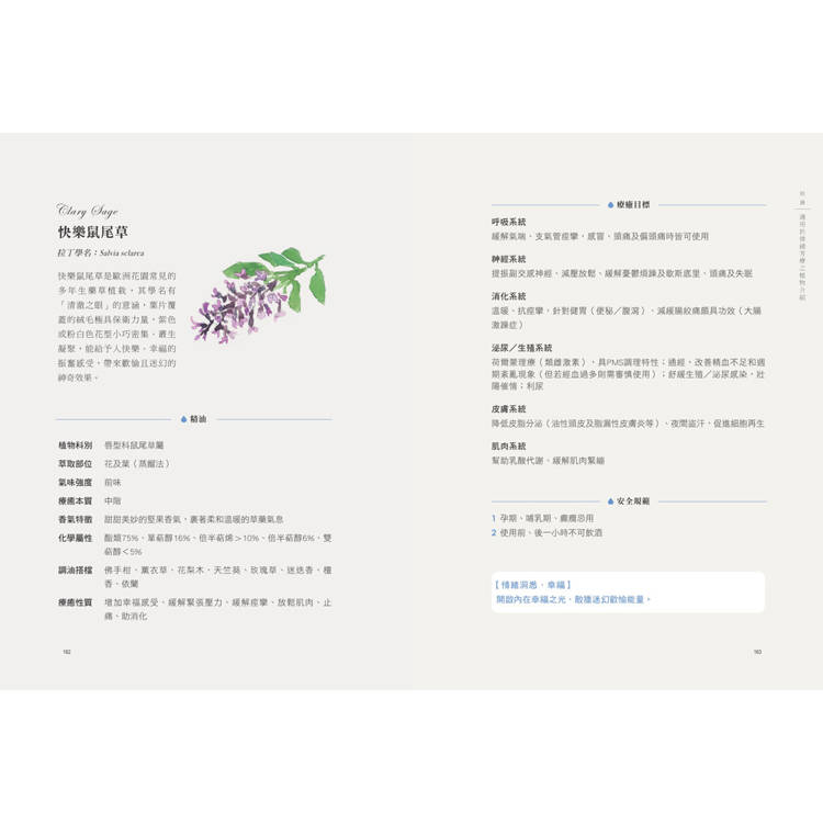 本書收錄有益於情緒排解、釋放、重生的48種植物,芳療師就每個實際案例,給予最適合的25個撫心配方,並可搭配「第六章 撫慰情緒的芳療解方」自製成11種芳療小手作,透過吸嗅法、噴霧法、塗抹法、濕敷法、浸泡法,讓「植物香氛的溫柔強韌」、「芳療導師的舒心小語」雙重療癒你心。