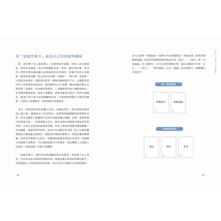 『情緒芳療卡』使用方式簡單,能幫助讀者釐清情緒,以及更深一層的自我探索,透過當下身心現況,內在的自救本能會依情緒所需,直覺選擇出相對應的卡牌,依照以下抽牌方式列出牌陣,即能為當下的自我解惑,建議使用時和書中的「附錄:適用於情緒芳療之植物介紹」一同比對,能更進一步了解植物的療癒特性。