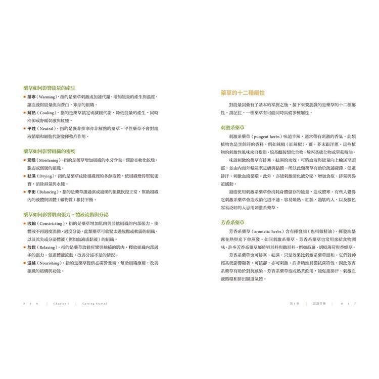 本書將藥草的屬性從味道、成分與基本作用分成十二大類,詳述藥草對能量及身體組織及體液流動等的影響,如苦味可以讓能量往下(至排泄器官)往內(至消化器官)輸送;刺激系的藥草可以打開血液、淋巴和能量的流動讓人放鬆等。瞭解藥草屬性及對身心的作用,能讓你使用藥草時更加自由。