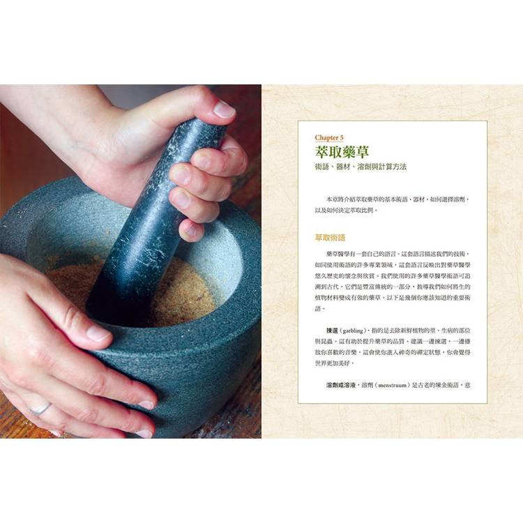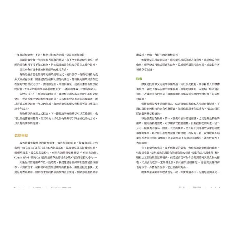 詳細說明新鮮與乾燥藥草不同的使用取向,以及多種居家就能執行的成分萃取法,從初階的水溶、油溶、醋溶、酊劑,到進階的滲漉、濃縮、索氏萃取等,不僅可製成藥草茶,還包括栓劑、丸劑、搽劑、藥草醋、藥膏、糖漿、牙粉、乳霜……等,是目前藥草調製及使用方式收羅最齊全的一本。