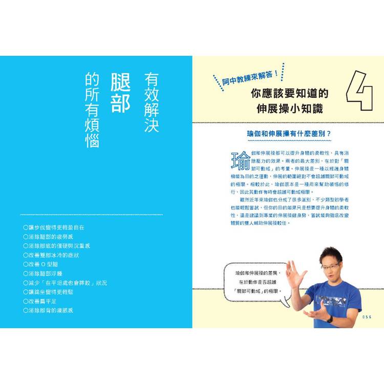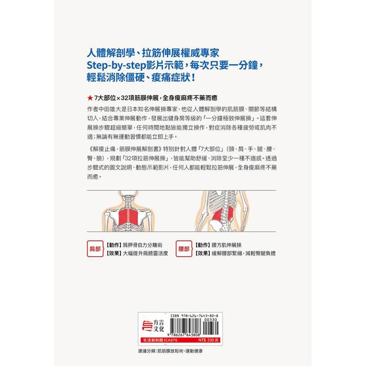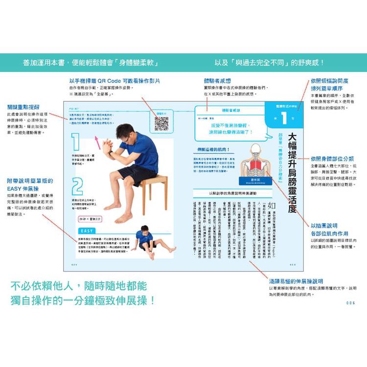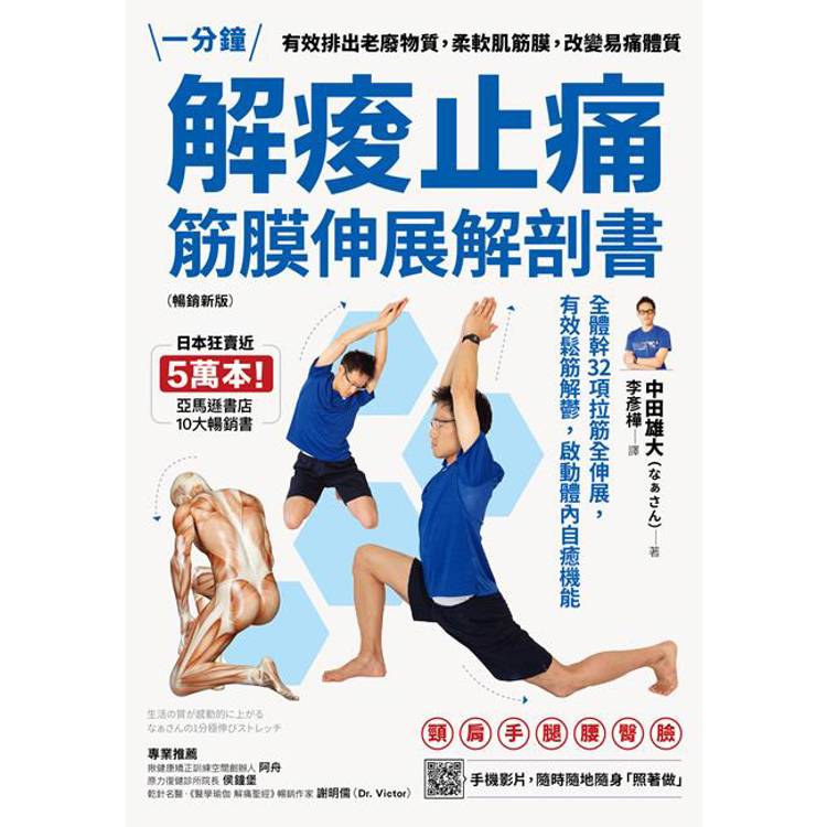 在《解痠止痛,筋膜伸展解剖書》中,他特別針對人體的「7大部位」(頸、肩、手、腿、腰、臀、臉),規劃「32項拉筋伸展操」,皆能幫助舒緩、消除至少一種不適感。透過步驟式的圖文說明、動態示範影片,任何人都能輕鬆拉筋伸展,全身痠麻疼不藥而癒。