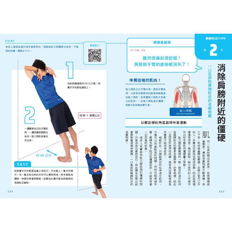或許有些人會認為光看照片不容易理解,為了幫助讀者更快上手,本書的每一式伸展操都附有 QR Code,只要以手機掃描,就能立即觀看伸展操影片的詳細介紹與真人(我本人)示範,請務必多加利用。如果本書能夠幫助各位減輕身體的疲勞及不適感,讓每天的生活更加快樂,將是我最開心的事情。