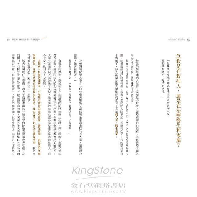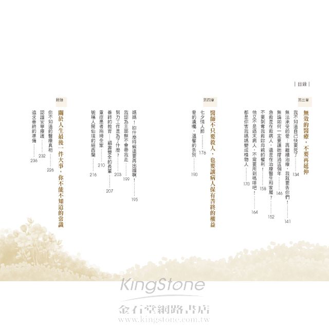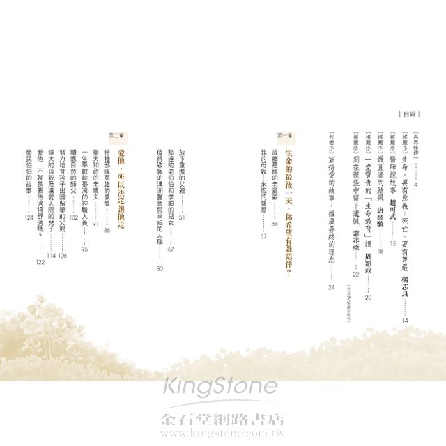人活著,是為了什麼?苟延殘喘的活是一種使命,還是家人所附加希望他不要走的枷鎖?本書提供了我們要懂得適時放手的依據,讓生命活得有價值才是我們之所以活著的目的,苟活對病人對家屬都只是徒增痛苦。