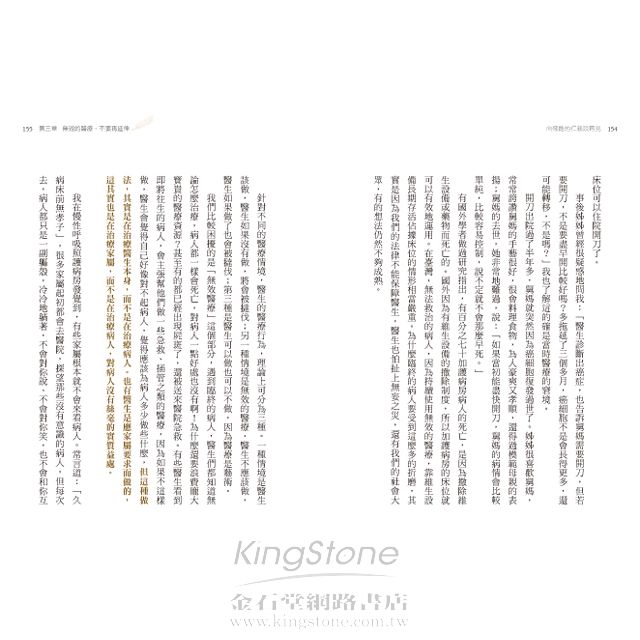 為此,作者不得不說出許多人,包括許多醫護人員,不敢說、不願說,或說不出口的話,這不能不說是作者的道德勇氣──尤其在台灣,這個對醫病關係、對末期病患的對待、對安寧照護的認知、對倫常聚散的觀念,仍有待撥雲見日的社會,這本書的出現並不容易。
