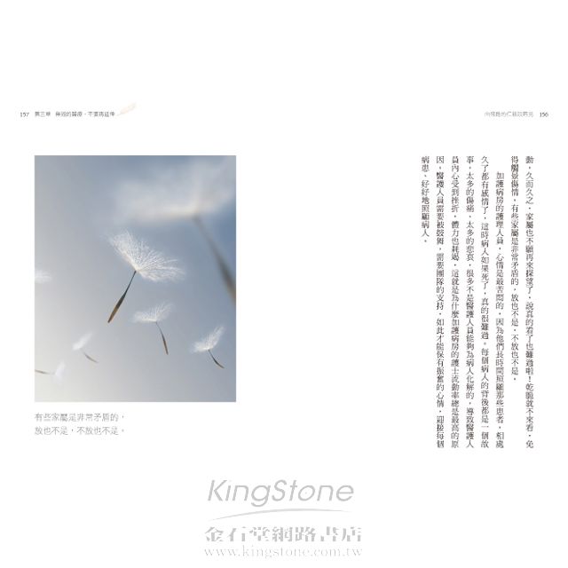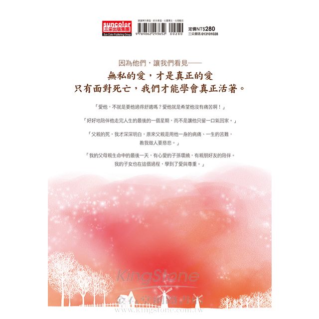 如果已走到了人生盡頭,放開手讓他有尊嚴地走,幫助他少一點痛苦,早一點解脫,才符合他自己最後抉擇,這就是衛生署推動安寧療護所秉持的理念,也是世界潮流,隨著民智日開,願接受這種服務的人正在快速增加,能提供這種服務的機構亦日見普遍。這本書可引發您深切的思維:處在健康的歲月裡,必須努力珍惜一切,面臨生命的終點時,必須懂得如何放下。全書雖非字字珠璣,但是內容篇篇感人,值得大家一讀,特別推薦給您。