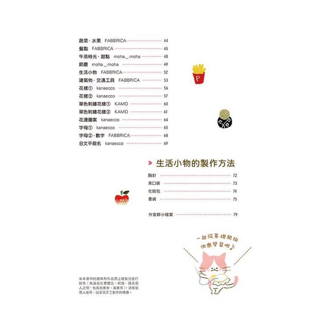 由5位日本職人傾心設計,可愛動物、清新花草、甜點雜貨等大集合,每個人都能找到自己的最愛。所有圖案均附上繡法、繡線色號與股數,清楚易懂,一步步照著做,享受美好的刺繡時光。
