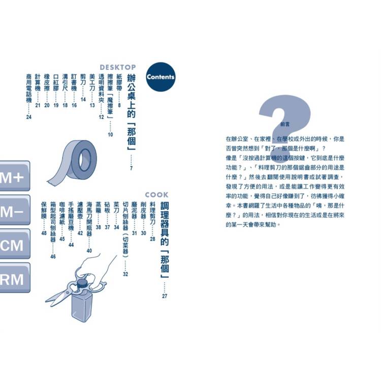 像是「雖然沒按過計算機的這個按鍵,它到底是什麼功能?」、「料理剪刀的那個鋸齒部分的用途是什麼?」。然後去翻閱使用說明書或試著調查,發現了方便的用法,或是能讓工作變得更有效率的功能,覺得自己好像賺到了!彷彿獲得小確幸。本書網羅了生活中各種物品的「咦,那是什麼?」的用法,相信對你現在的生活,或是在將來的某一天會帶來幫助。