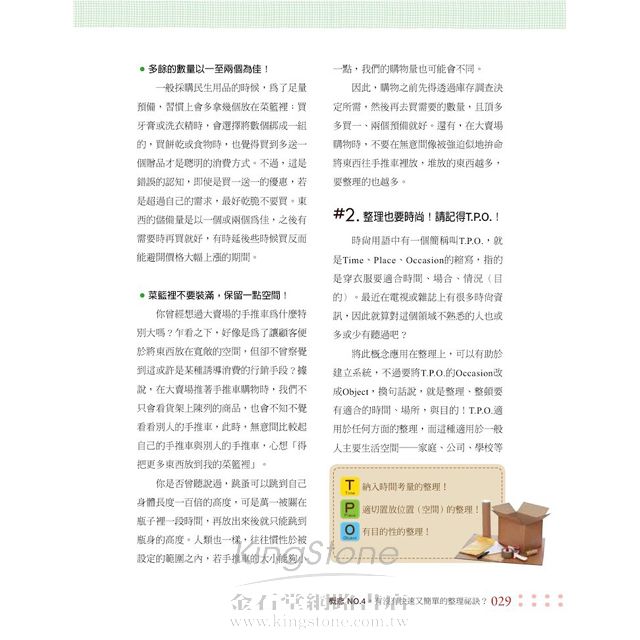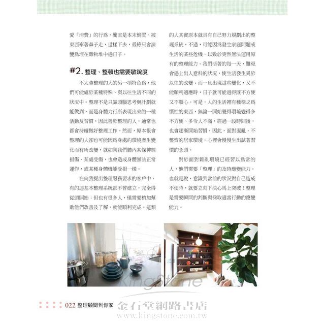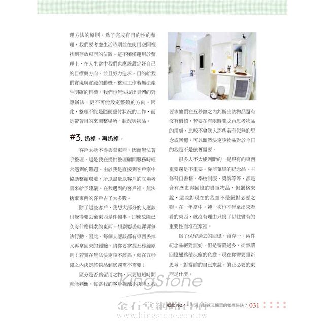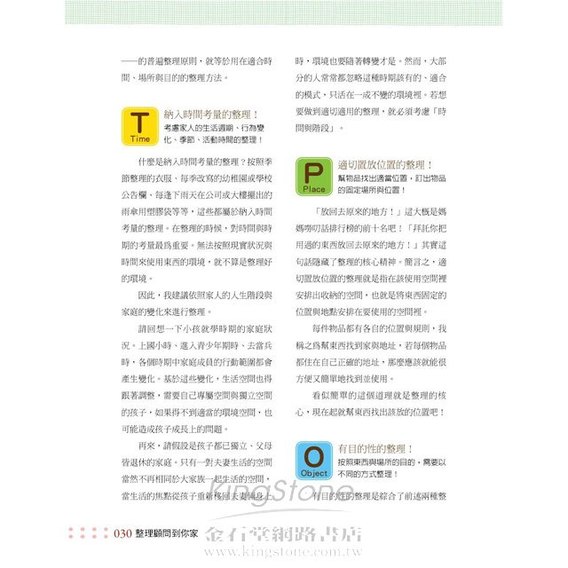 針對這點,我想做個澄清。最需要整頓的地方當然是家裡沒錯,但是,將整理斷定為做家事,這是錯的;在每日生活中,無論吃的、用的大部分都在家裡,我們待最久、最常與各種物品互動的地方也是在家裡,因此,居家環境當然需要更多的整理。然而,將整理視為家務瑣事是不對的,整理不僅是家庭所需,更是在所有生活空間裡都必須要有的習慣。